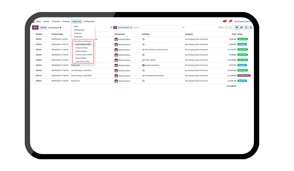 Navigate to the Sales module by selecting Sales -> Reporting -> Advanced Sales Reports. Under the Advanced Sales Reports section, you can find all report menus.