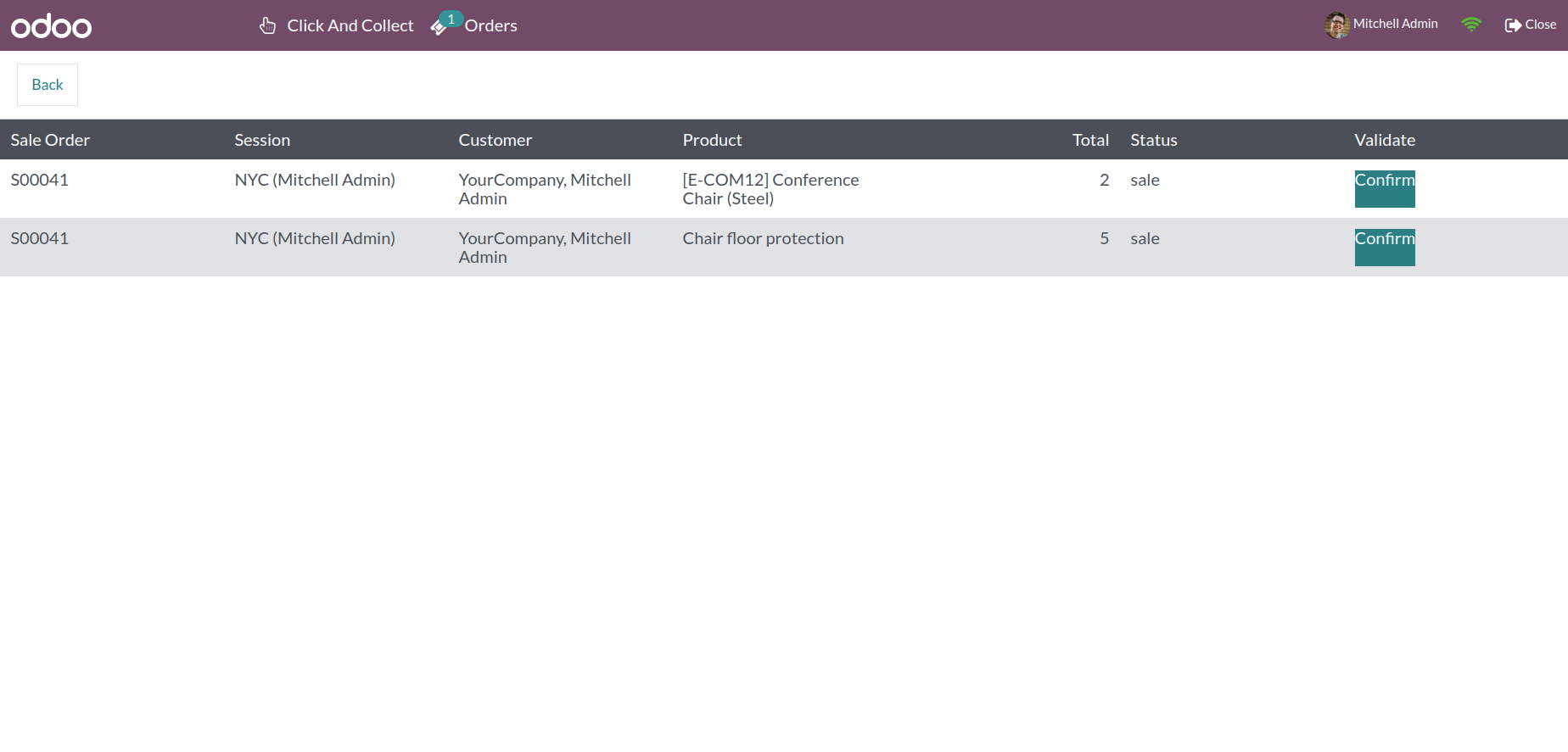 ->All click and collect products and the customer's selected pos session are visible in the sale order lines. The user may view all the click and collect products by clicking on the click collect smart tab.
