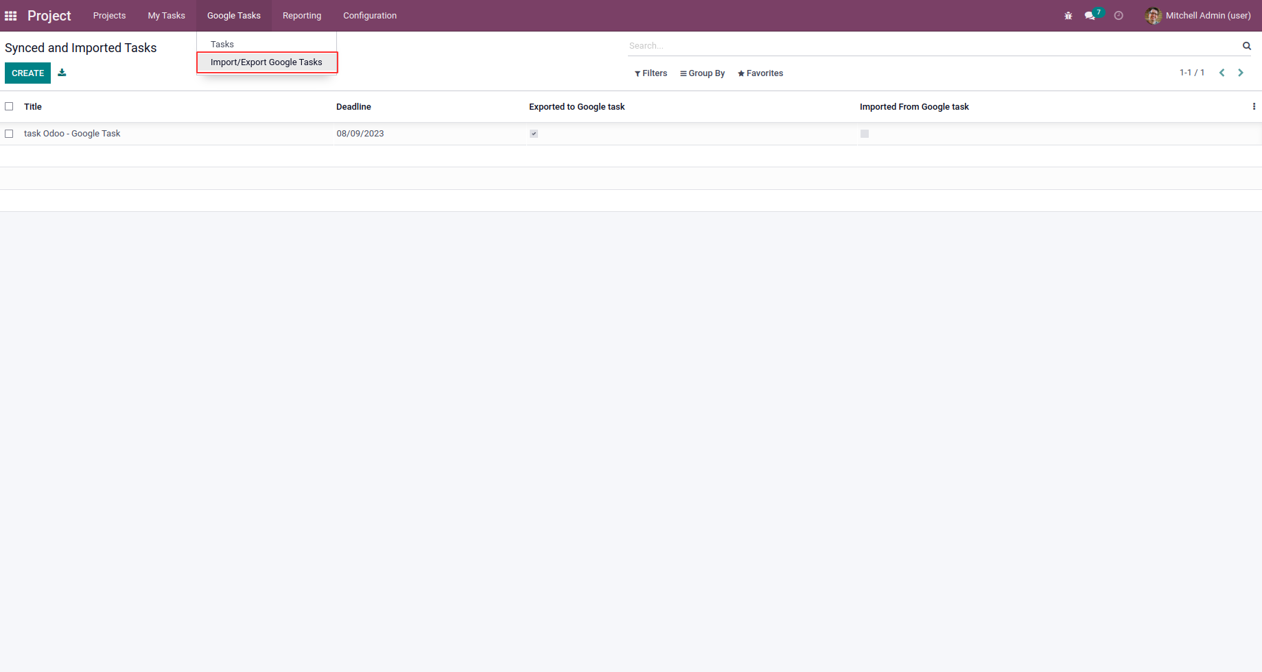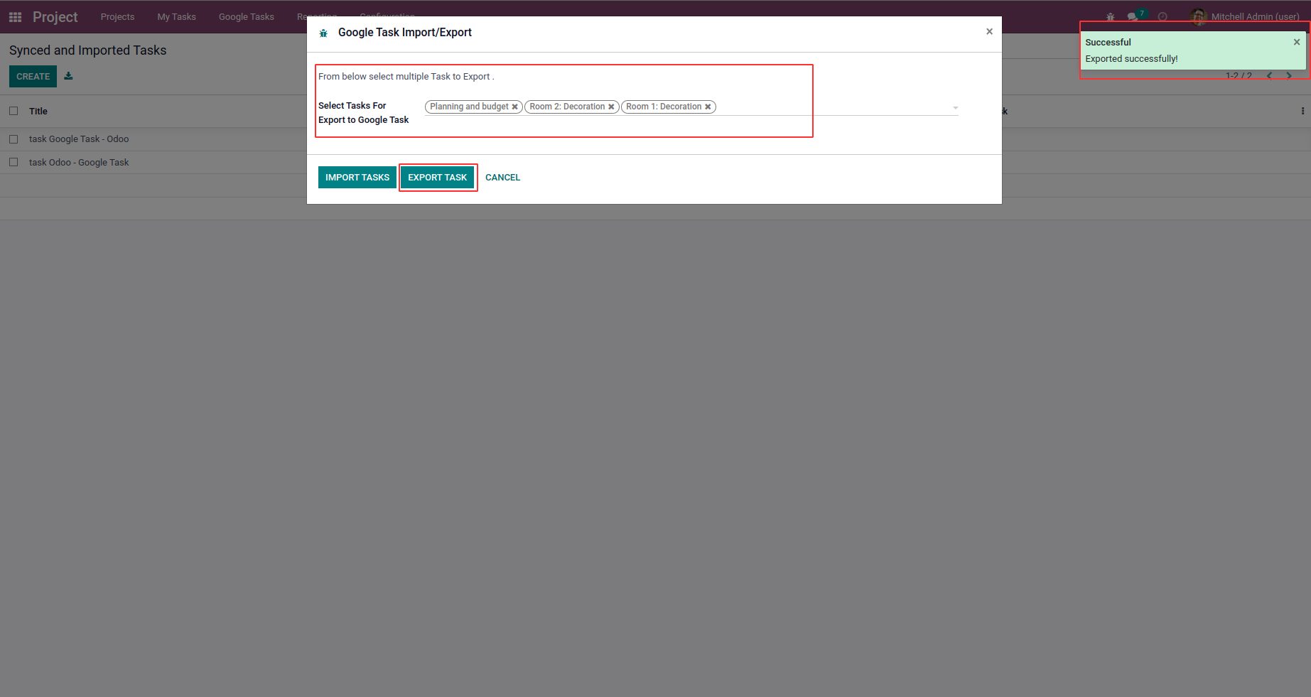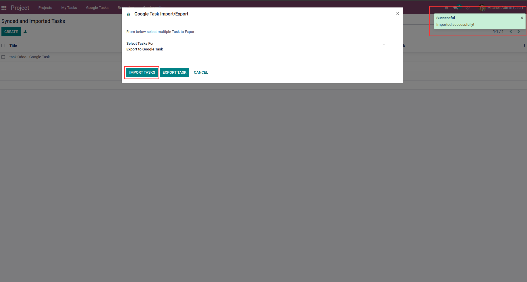 Google Tasks Integration for Project and Tasks odoo app helps users to sync project tasks with Google Tasks. Users have the option to sync tasks with Google or if a user updates a task then google Tasks also get updated. Import / Export task from Odoo to Google Task and vice versa