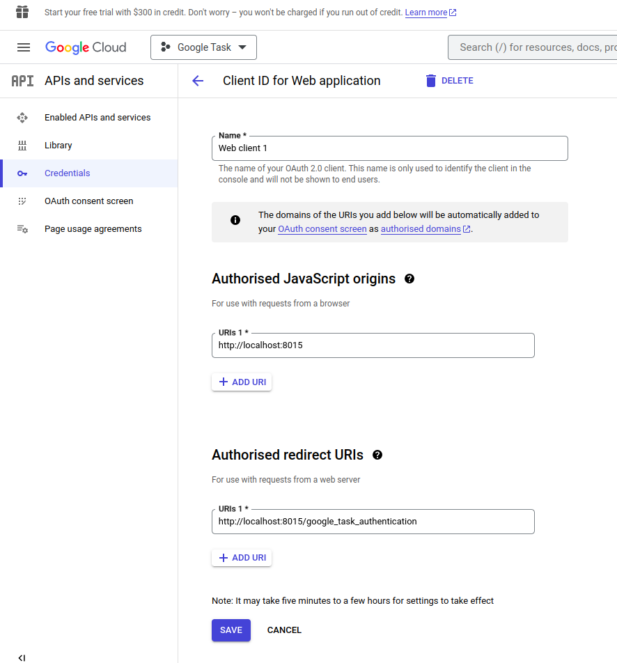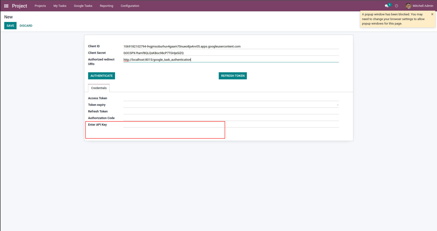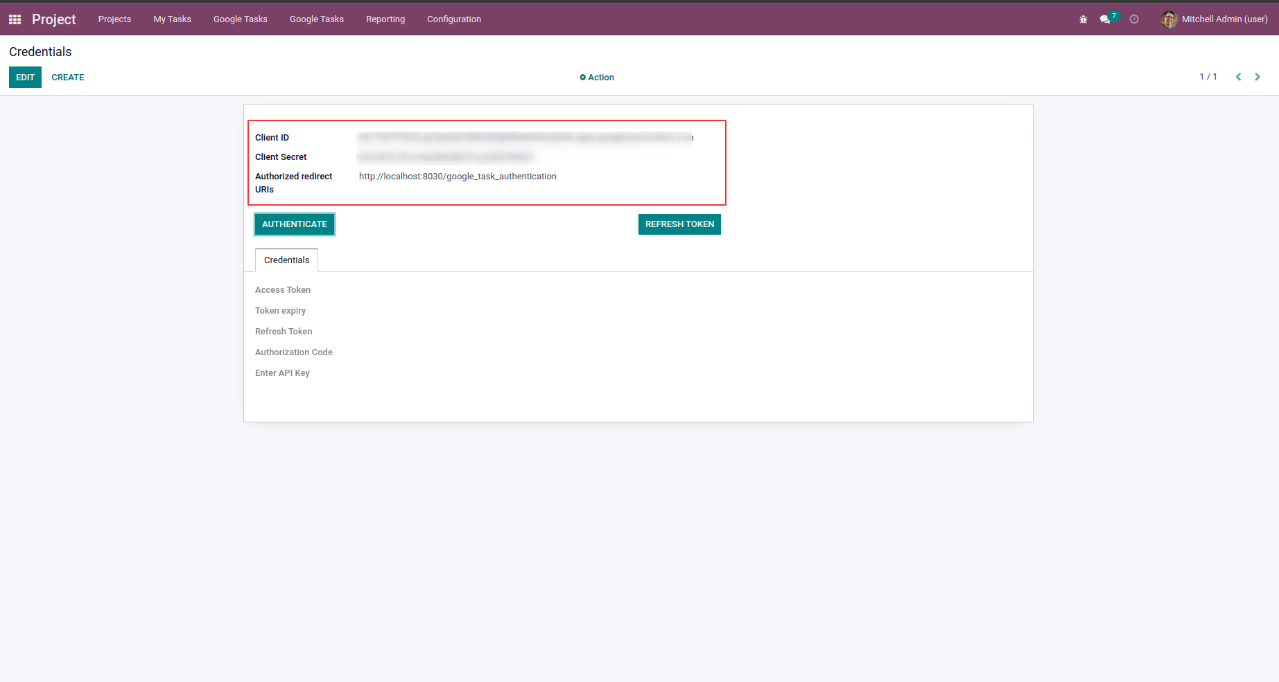 Under Configuration > Google Task Credentials , add Client ID ,Redirect URI and Client Secret then Click "AUTHENTICATE" button.