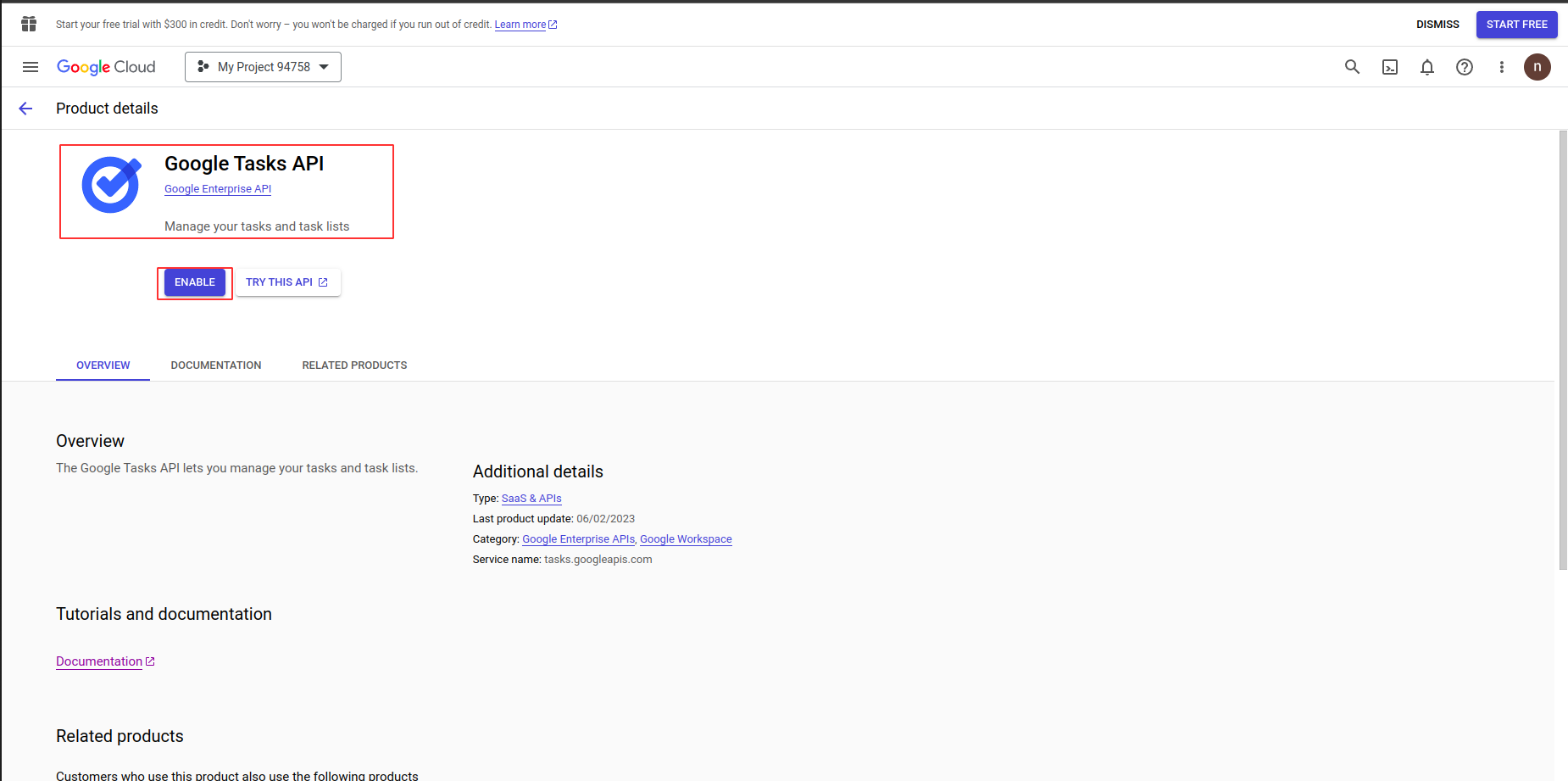 Search for "Google Tasks API", Open and click "ENABLE" to use.