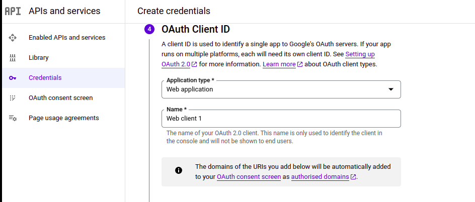 Select "Web application" as Application type and enter Name, Click "Add URL" under "Authorized redirect URIs" and enter your URI.