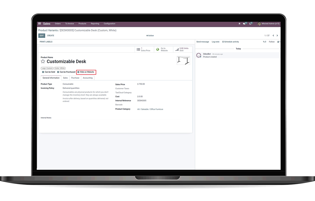 We can click on the checkbox 'Hide On Website' to hide the Product Variants from the Website