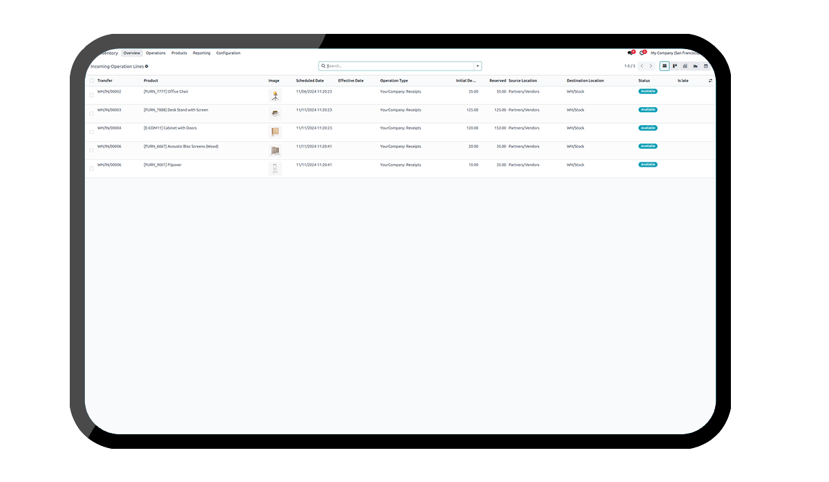 Transfer Order Form are attached with images of their related products in the tree view of stock move lines.