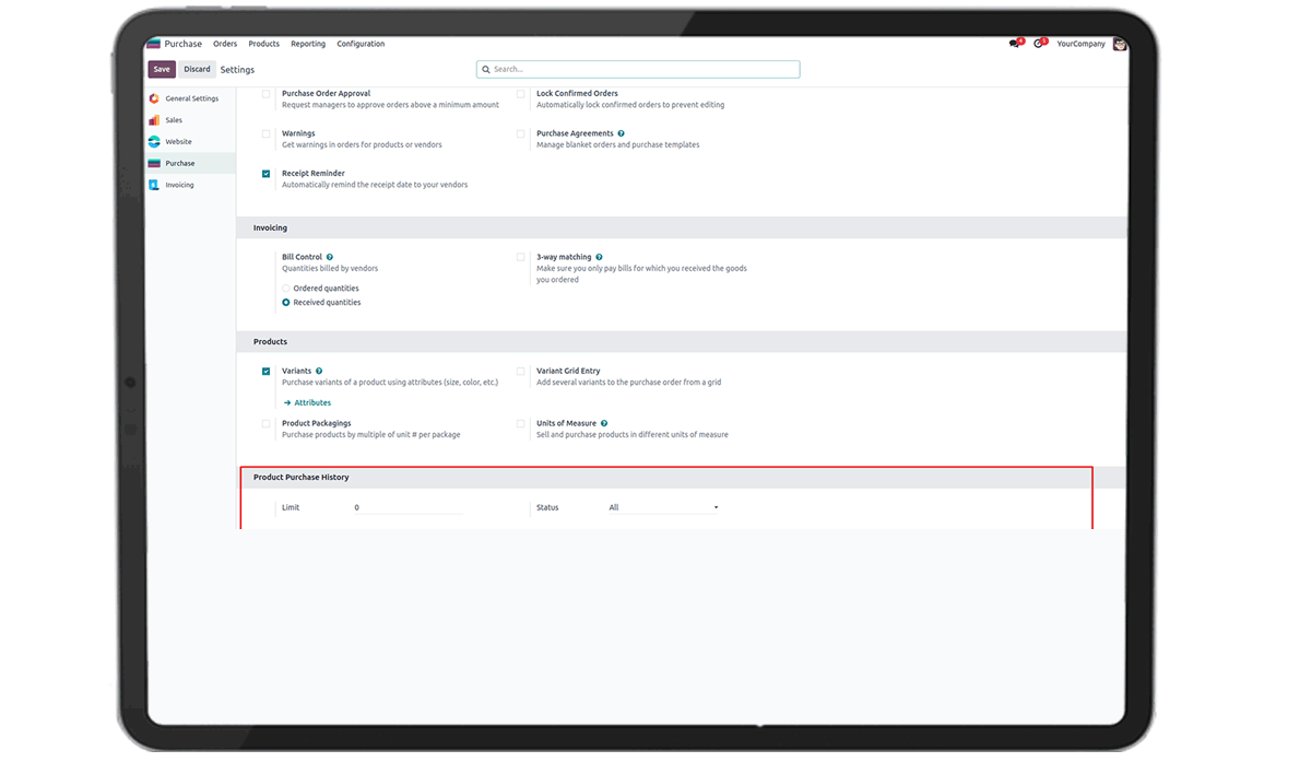 Go to Settings => Product Purchase History, Set Limit and Status[All, RFQ, and Purchase Order] for purchase history. From the setting set limit = 0 and select status as 'ALL'.