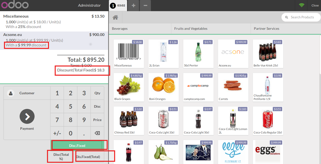 A new button 'Disc.Fixed' is added for providing fixed discounts on orderlines. By clicking on this button, we can enter the fixed discount. After we have entered the discount, it will be shown under