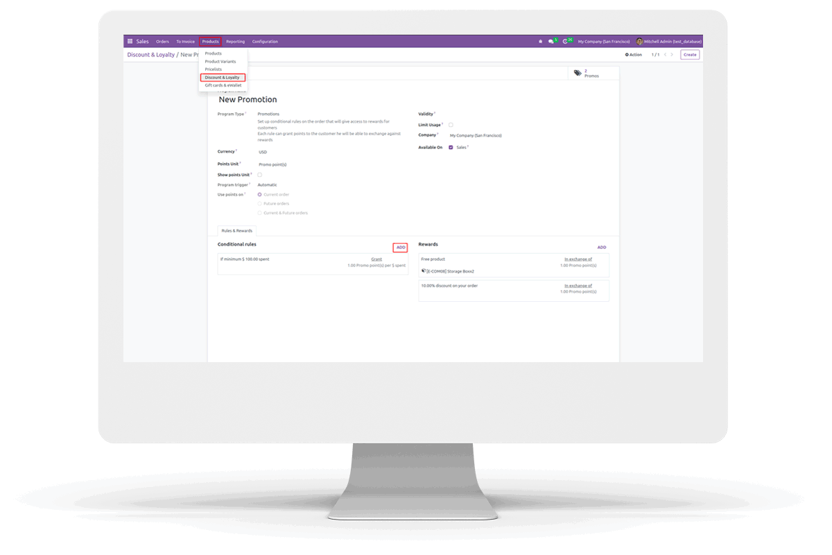Firstly you should ensure that the debug mode is on. Go to Sale -> Products -> Discount & Loyalty ->Create a new program. After creating the program we can see that a 'Add' button in Rules & Reward section.