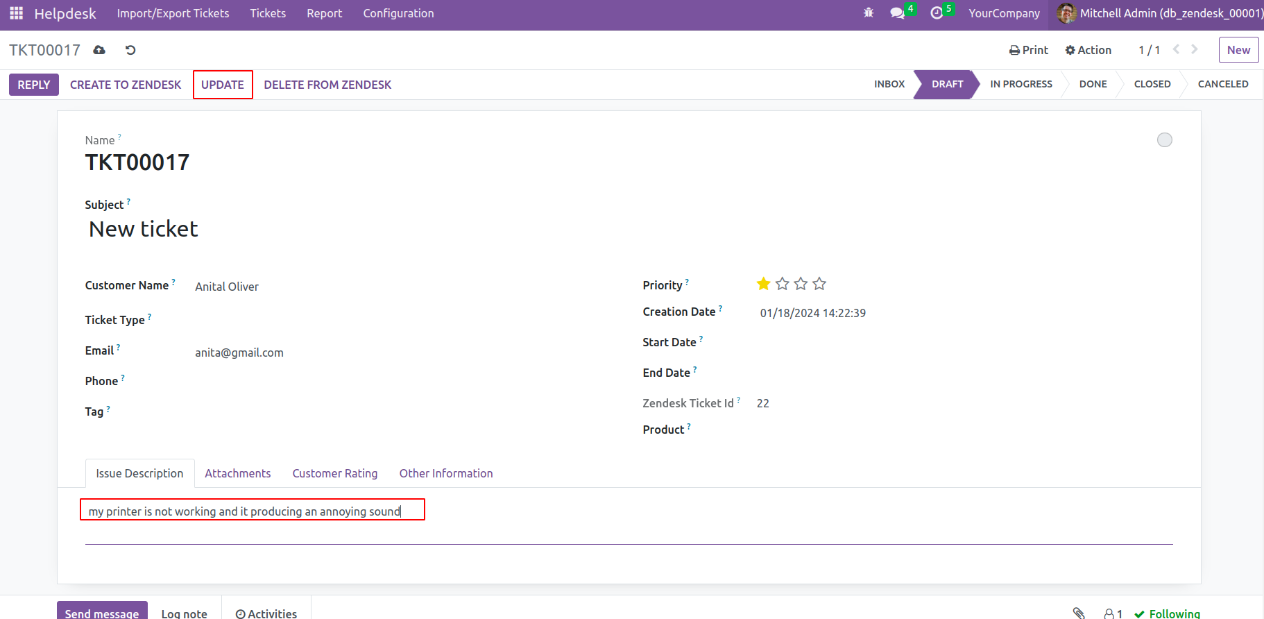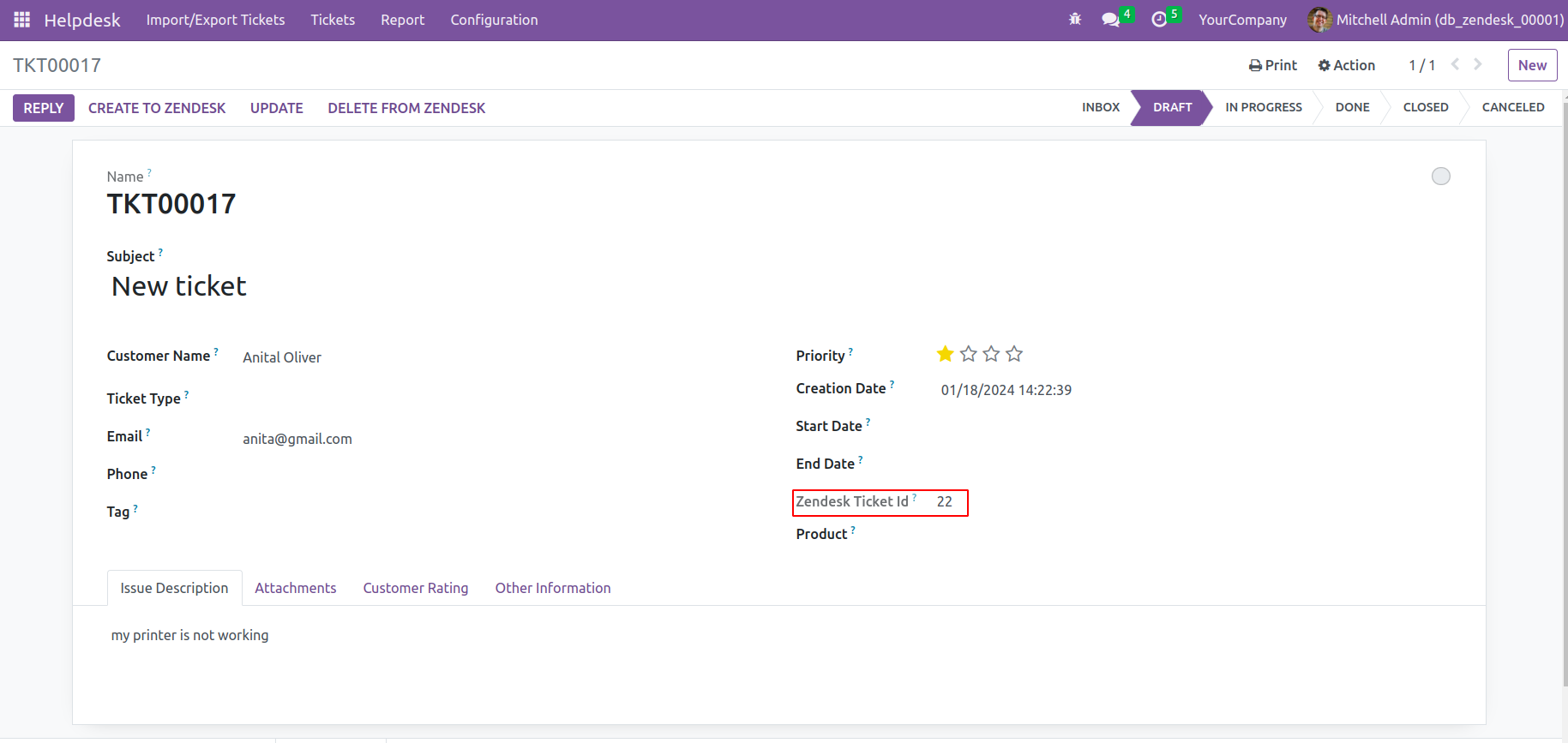 After creating the ticket in Zendesk we can see the Id of that ticket corresponding in the Zendesk