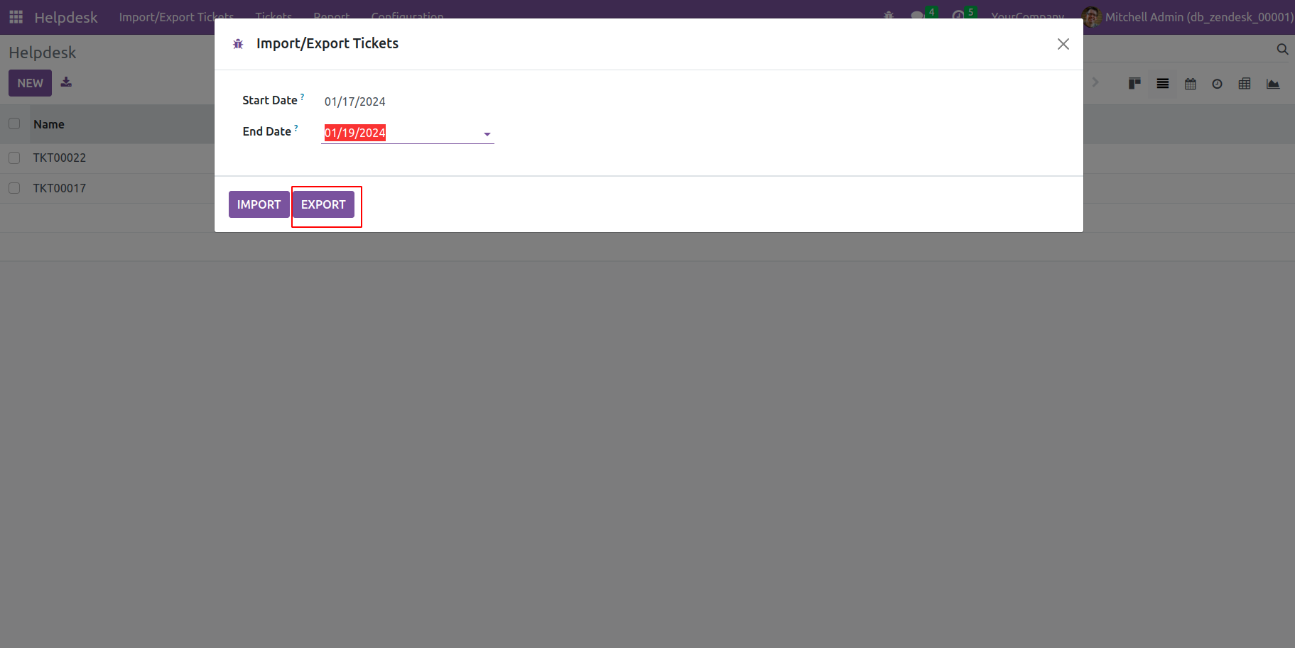 Can see a wizard will open and in that you can provide two dates, between in which we want to import/export tickets