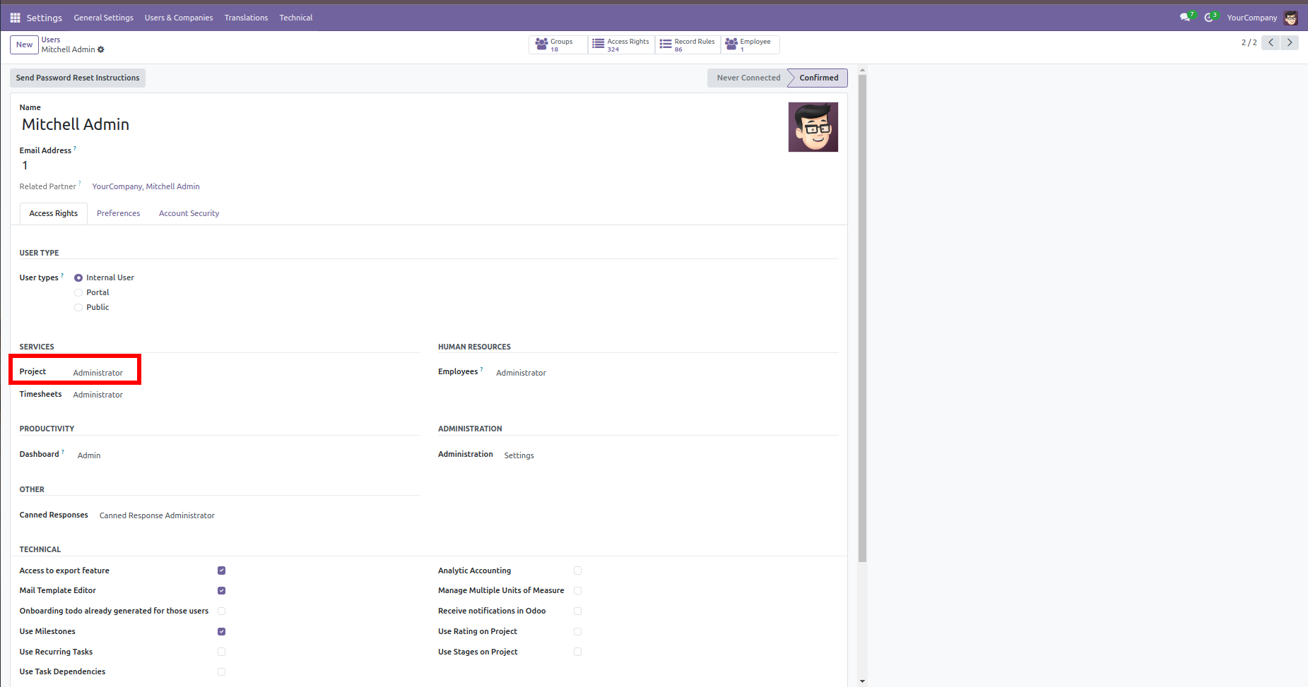 Go to Settings -> Users & Companies -> Users -> Project : Administrator
