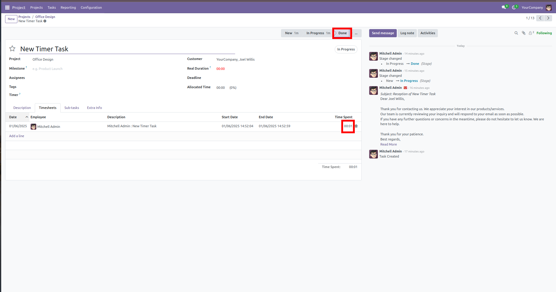 The timer stops running when the task moves to any other stage and the timesheet will update with the ending time also we can see the time when the timer stops.
