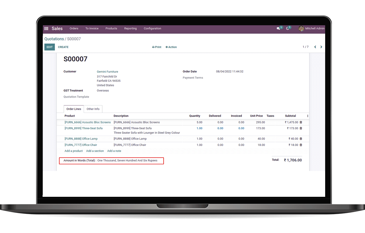 In the Amount in words invoice App, We can convert the total amount into the corresponding words. This feature can be available in sale, purchase, invoice modules. The amount in words will be available in forms, reports and email templates.