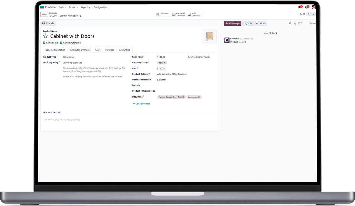 Documents Attached to a Product will be Visible in the Purchase Orderline and will be Automatically Attached to the Mail.
