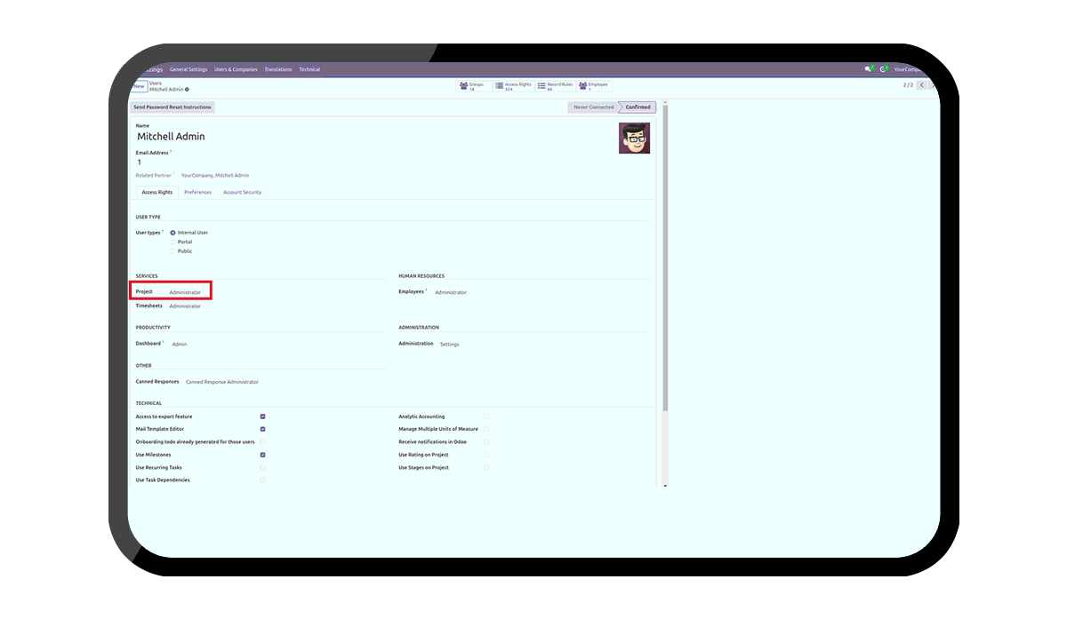 Go to Settings -> Users & Companies -> Users -> Project : Administrator