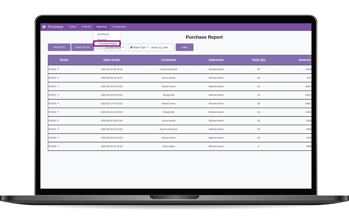 This app useful to provide different Purchase Reports to do analysis. It shows the Purchase analysis of a company in many aspects such as by order,order details,salesman and so on. It can be filtered out based on different date ranges too.