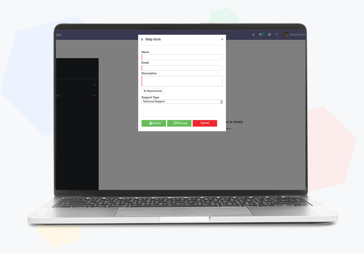 This modules helps user to raise support to Cybrosys Technologies(Odoo Support). User can seek support for both technical and functional aspects. One can seek support via email or whatsapp.