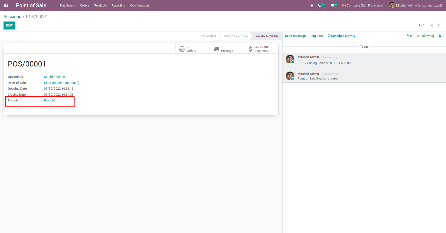 Branch is added for POS Sessions.This will be updated based on the branch set for POS.