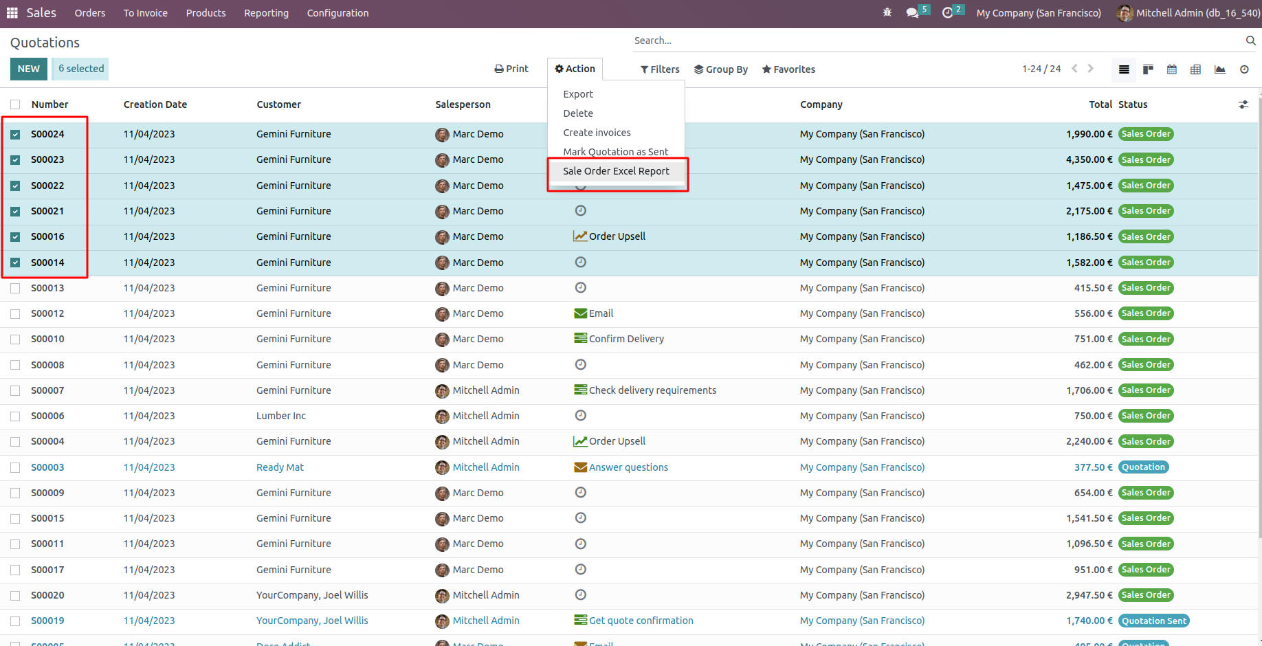 Go to Sales -> select records from the tree view for the sale order -> From the action menu -> Sale Order Excel Report