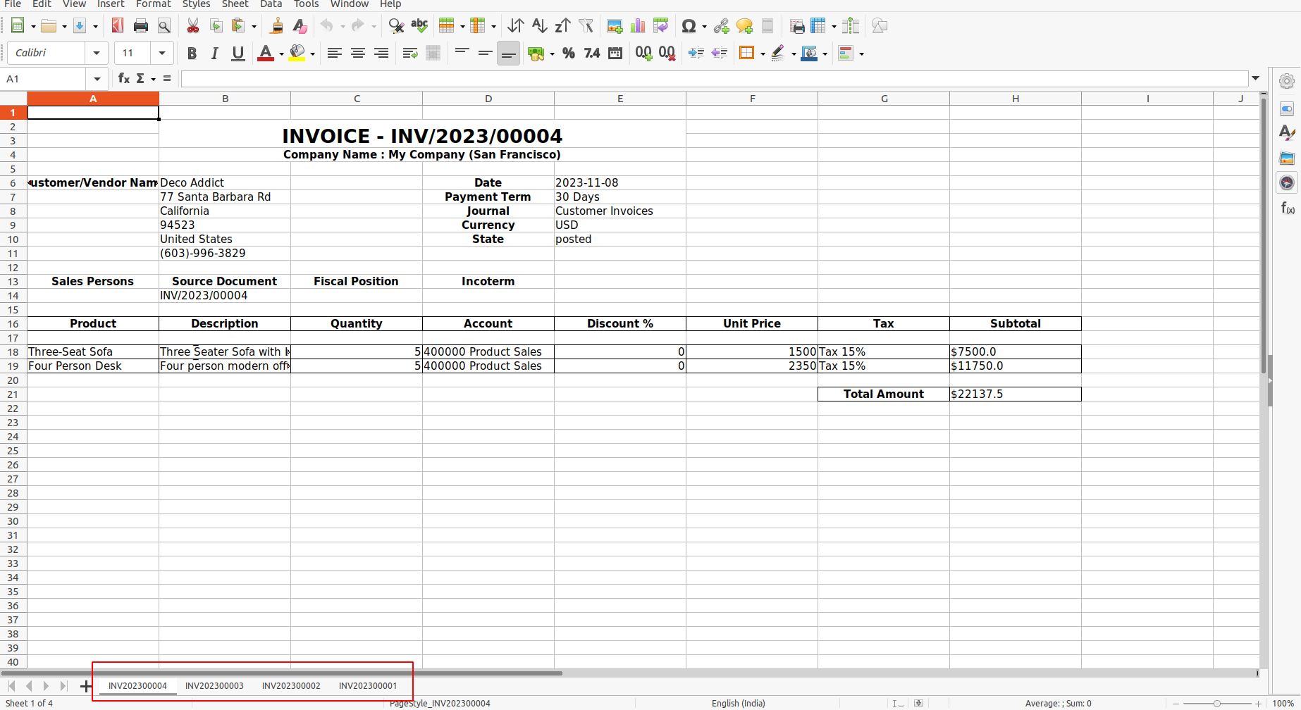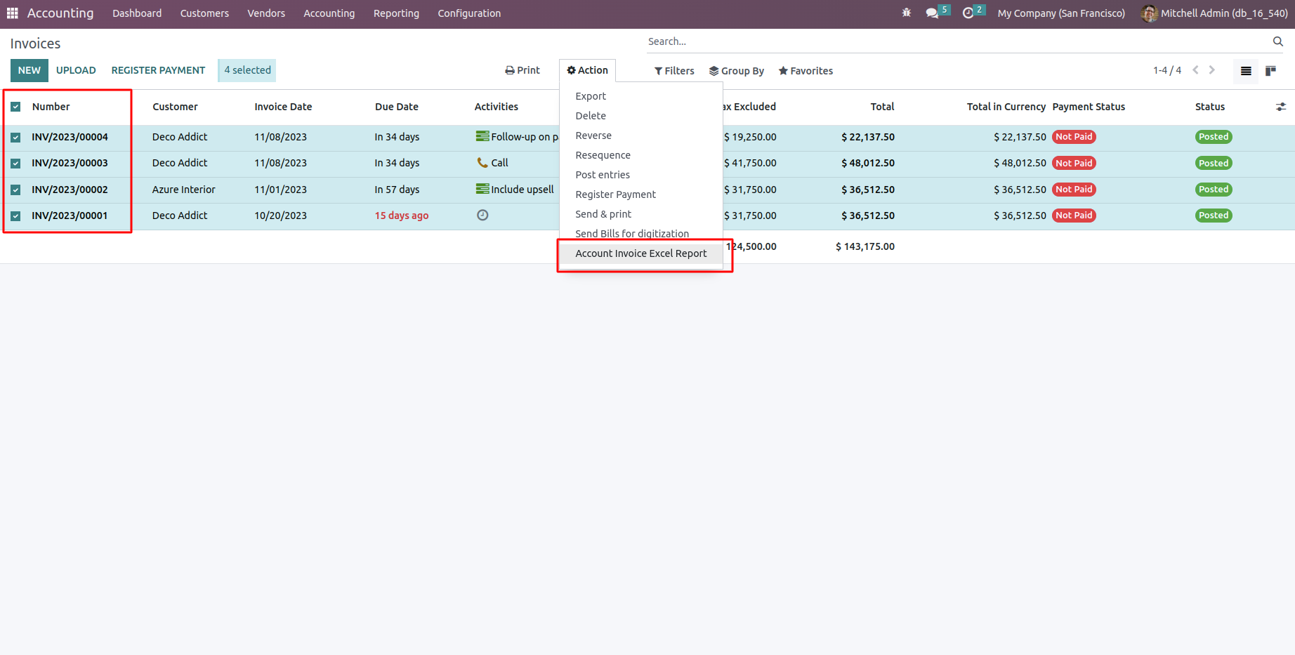 By clicking the Account Invoice Excel Report button we can print the Excel report