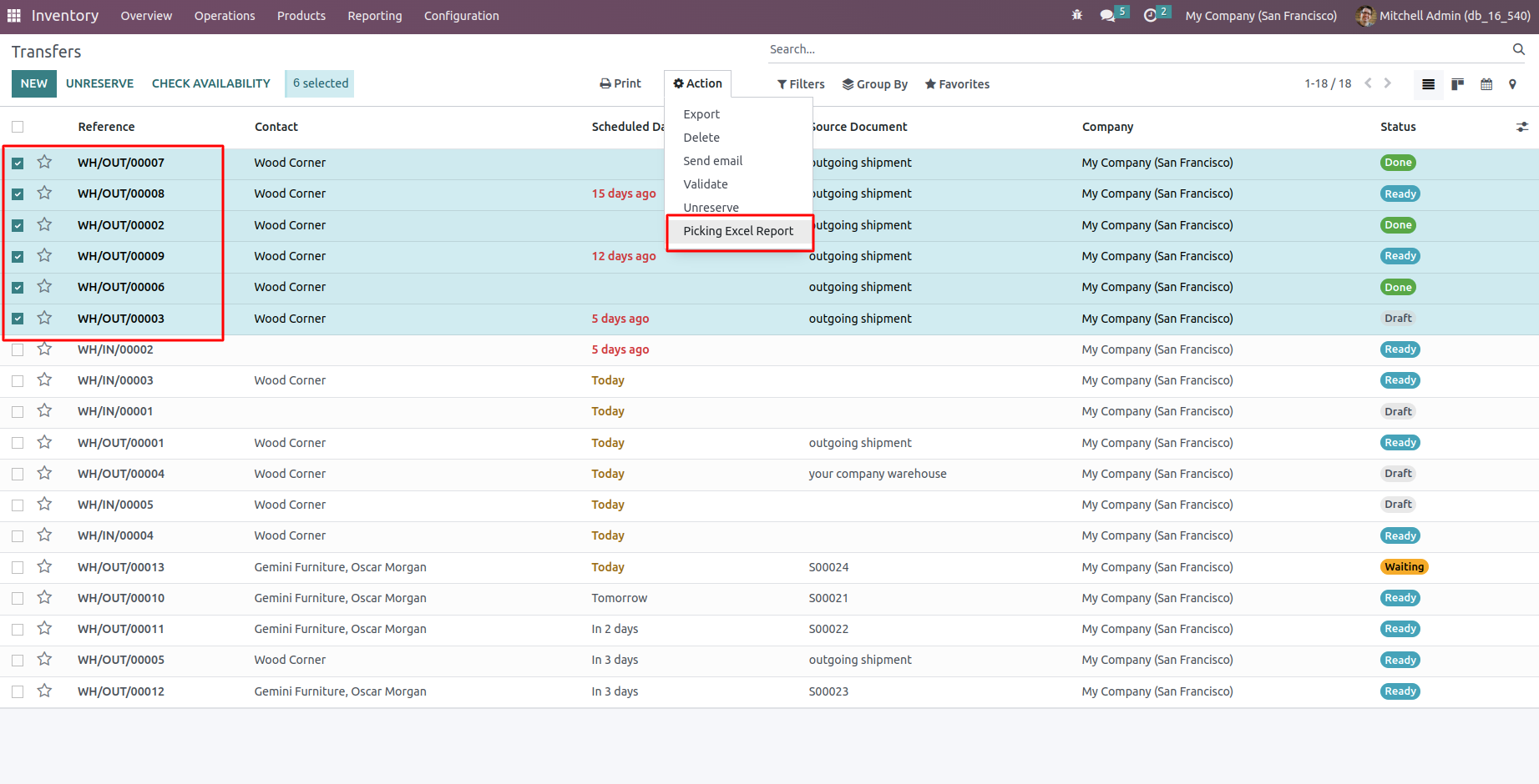 Go to inventory -> select records from the tree view for the transfer -> From the action menu -> Picking Excel Report