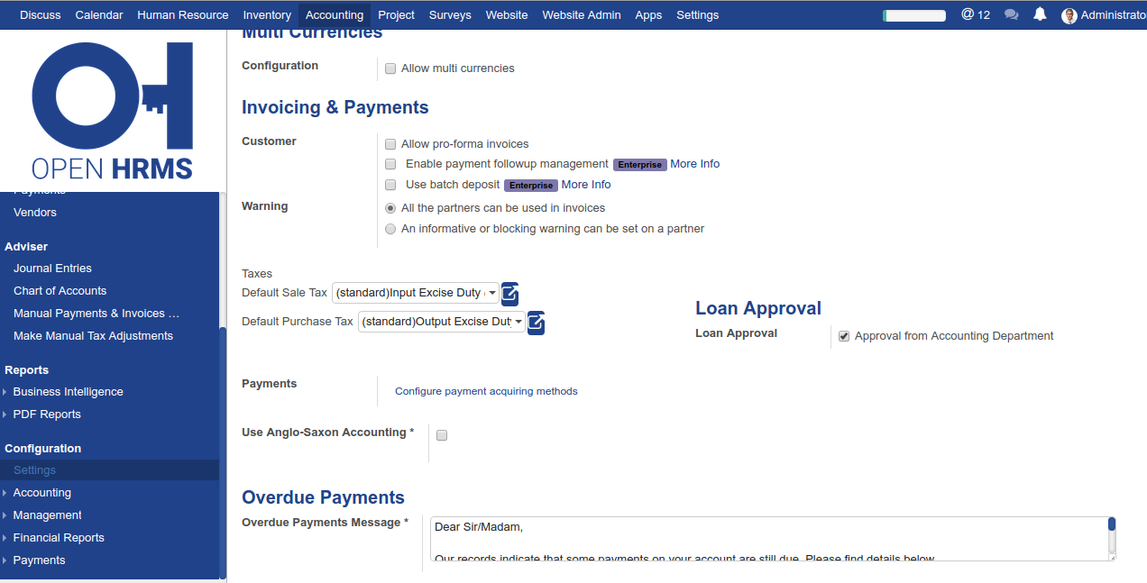 Install the Module "Open HRMS Loan Accounting" in order to enable Accounting Entries. Enable the option "Loan Approval From Accounting Department" In accounting settings