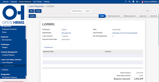 Open HRMS Loan is a component of Open HRMS suit. Open HRMS Loan module helps the user to configure different loan policies, assign approval authority, conduct the verification process and sanction loan for employees.