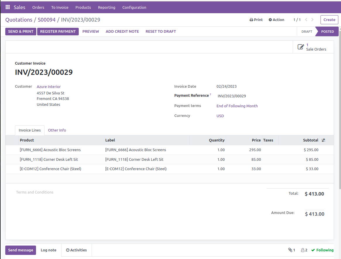 User can see invoice is validated automatically and sent message is linked with chatter which is sent to customer.