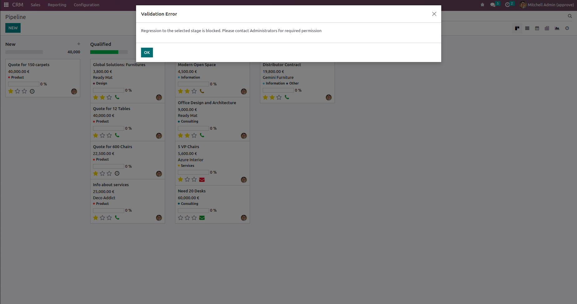 If the user tries to regress the opportunity to the specified stage, warning will be displayed