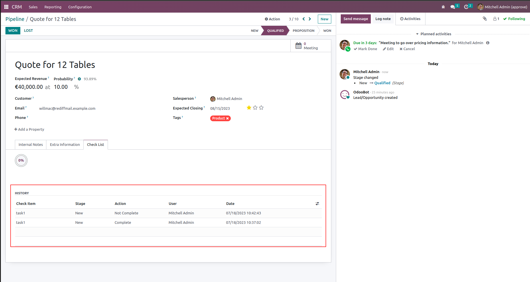 Making a customer from an opportunity is the goal of the CRM pipeline. To achieve that goal sales staff needs to undertake a specific sequence of actions or tasks. Each of those actions is important on the defined stage. For working as an efficient company The CRM is an important part. This app provides a checklist for each pipeline stage to control requirements, fulfillment and to make sure that each action/checklist item is fully approved by responsible users. So that it will be easier to manage through CRM pipelines.