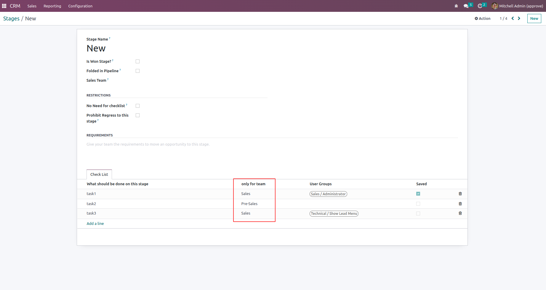 The opportunity can be only progress to upper stages if the checklist items are fully completed to the selected user/team.