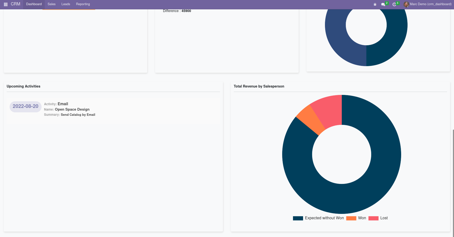A dedicated Funnel Chart provides you with complete insight into the Leads which are in operation. The leads will be depicted as New, Qualified, Proposition, and Won. Moreover, the Year date target will provide an insight into the goals which are achieved. The Donut graph based on the monthly Lead operation will provide a clear picture of the monthly Lead operations. Additionally, the Activity Donut graph will describe the activity analysis on the leads.