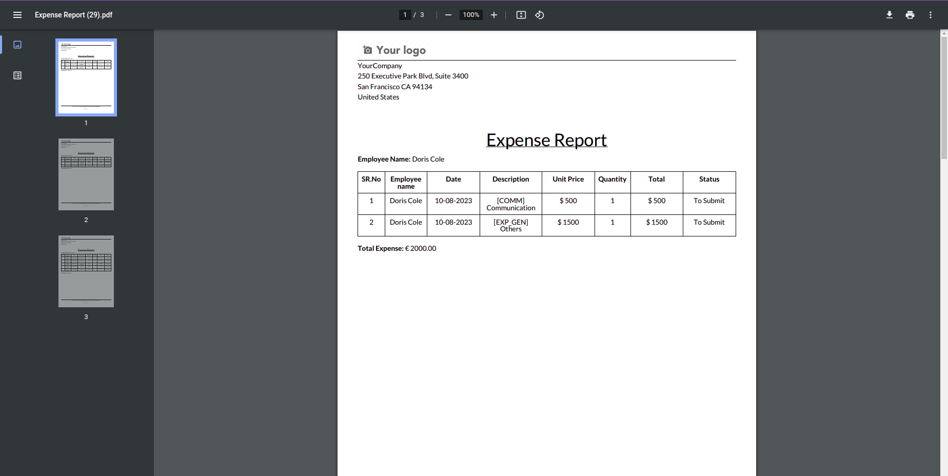 This application facilitates the printing of employee reports, offering the admin the flexibility to generate multiple expense reports using custom dates. Additionally, the admin can print reports based on various status categories, such as to submit, submitted, approved, paid, refused, or view all reports.