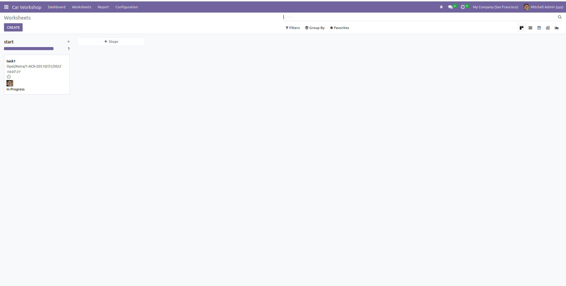 Goto Car Workshop -->Worksheet Organise all the works according to their Status. Works/Tasks assigned works using the kanban view and control deadlines in the calendar view.Each Work may have it's own stages.