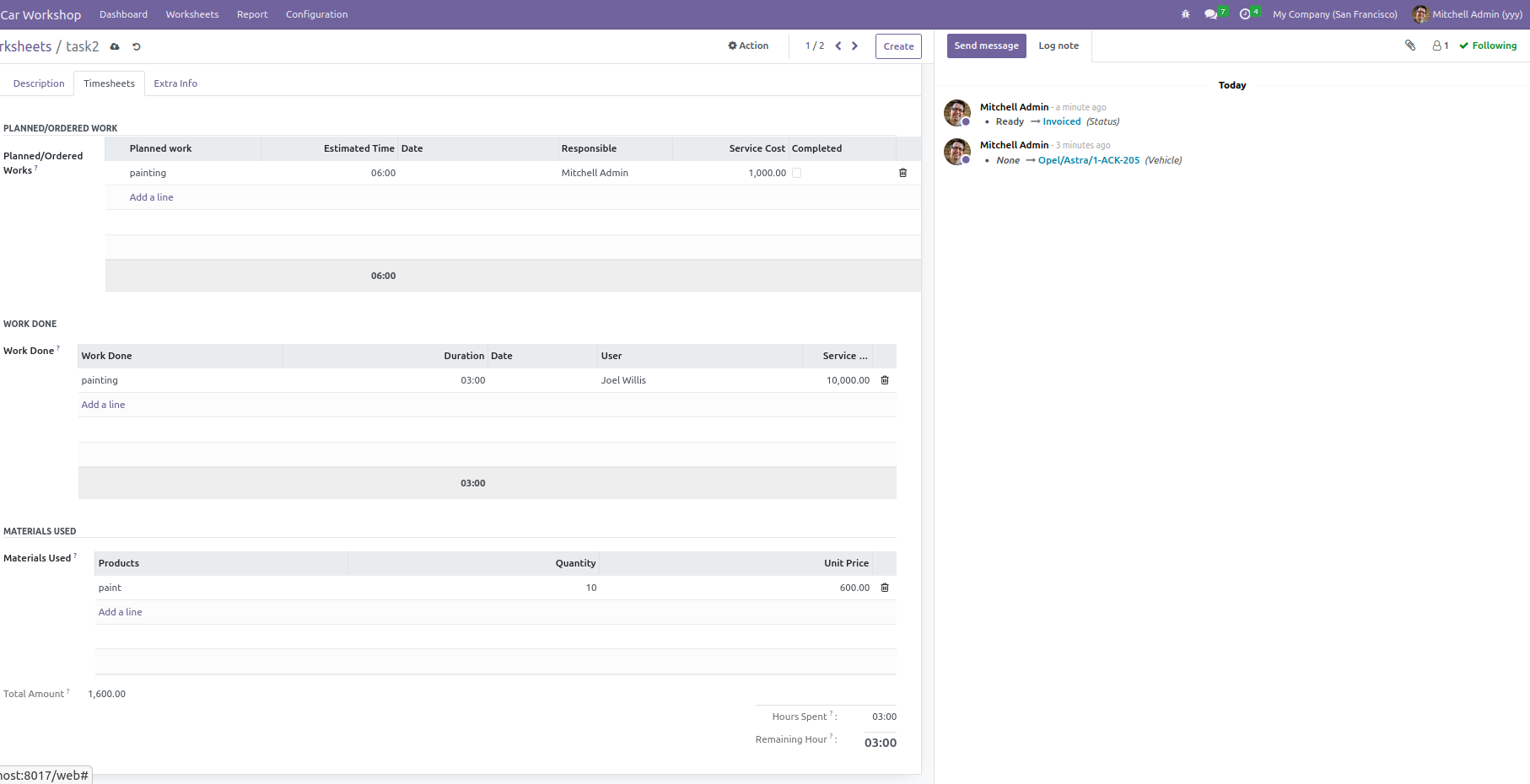 Goto Car Workshop >Worksheet >Timesheet In timesheet ,Planned work is the sub works related to main Work. By ticking 'Completed' that work will be automatically updated to Work done.
