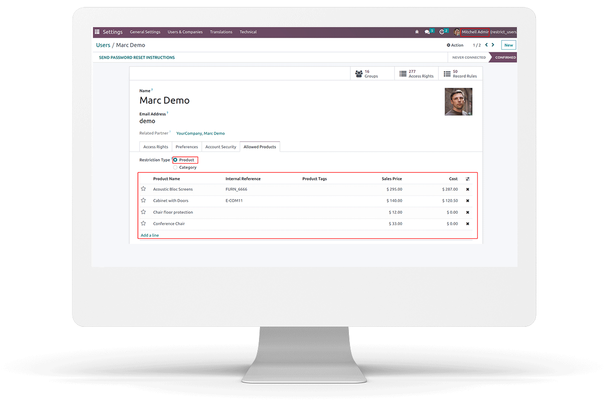 Set a restriction type for to allow product and product category based on the selection of product and category and added the allowed products in the user.
