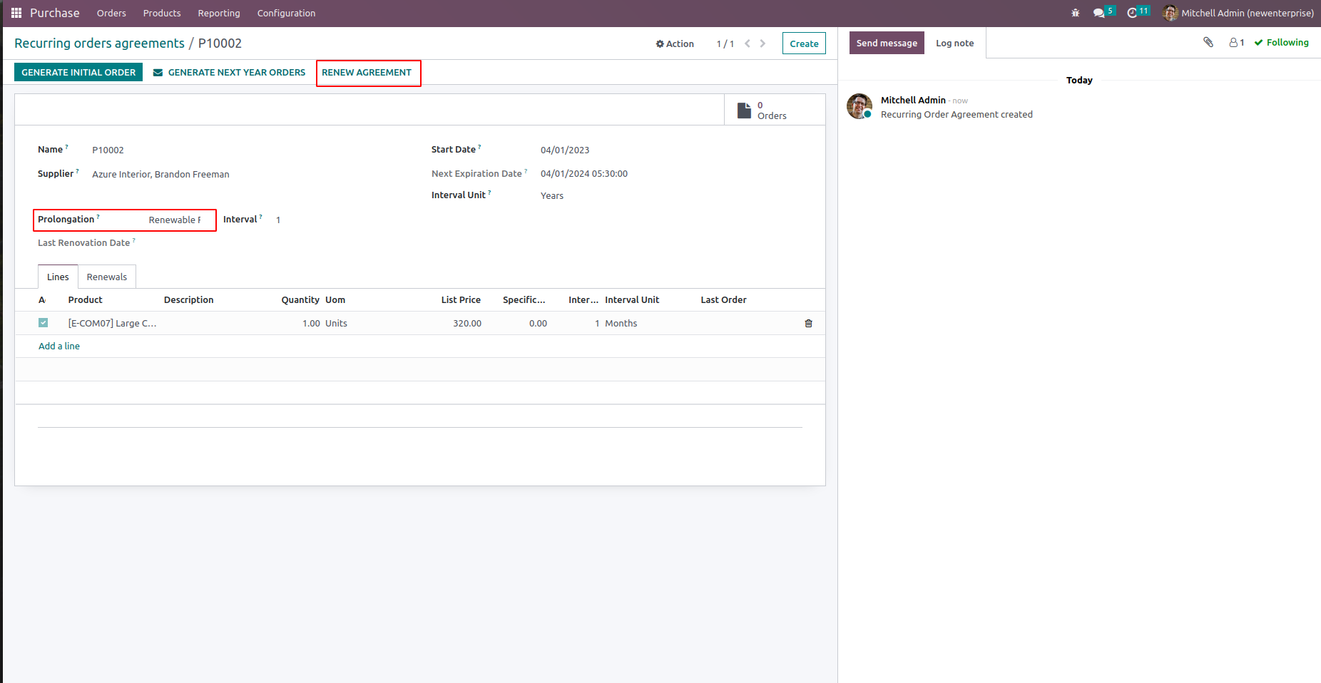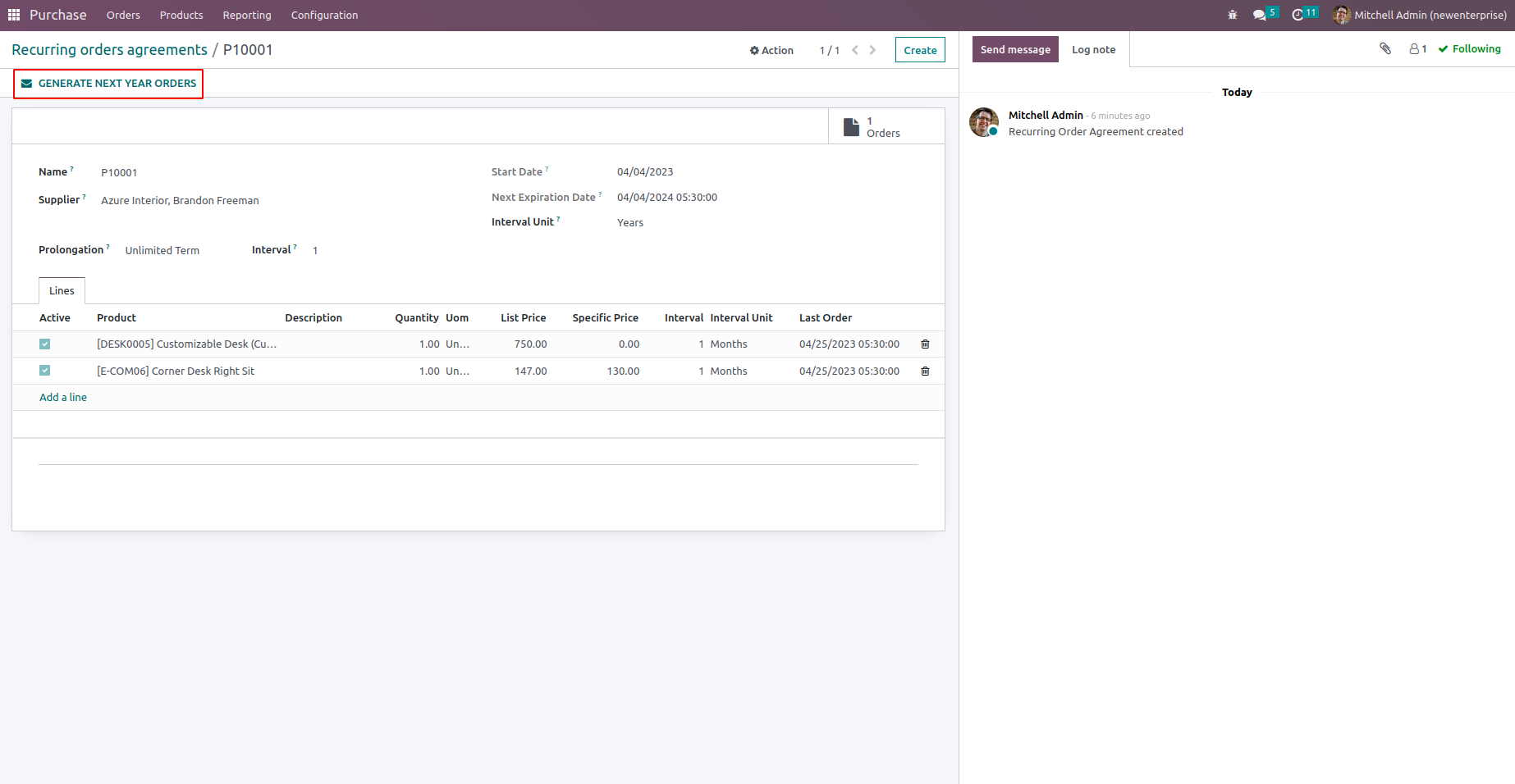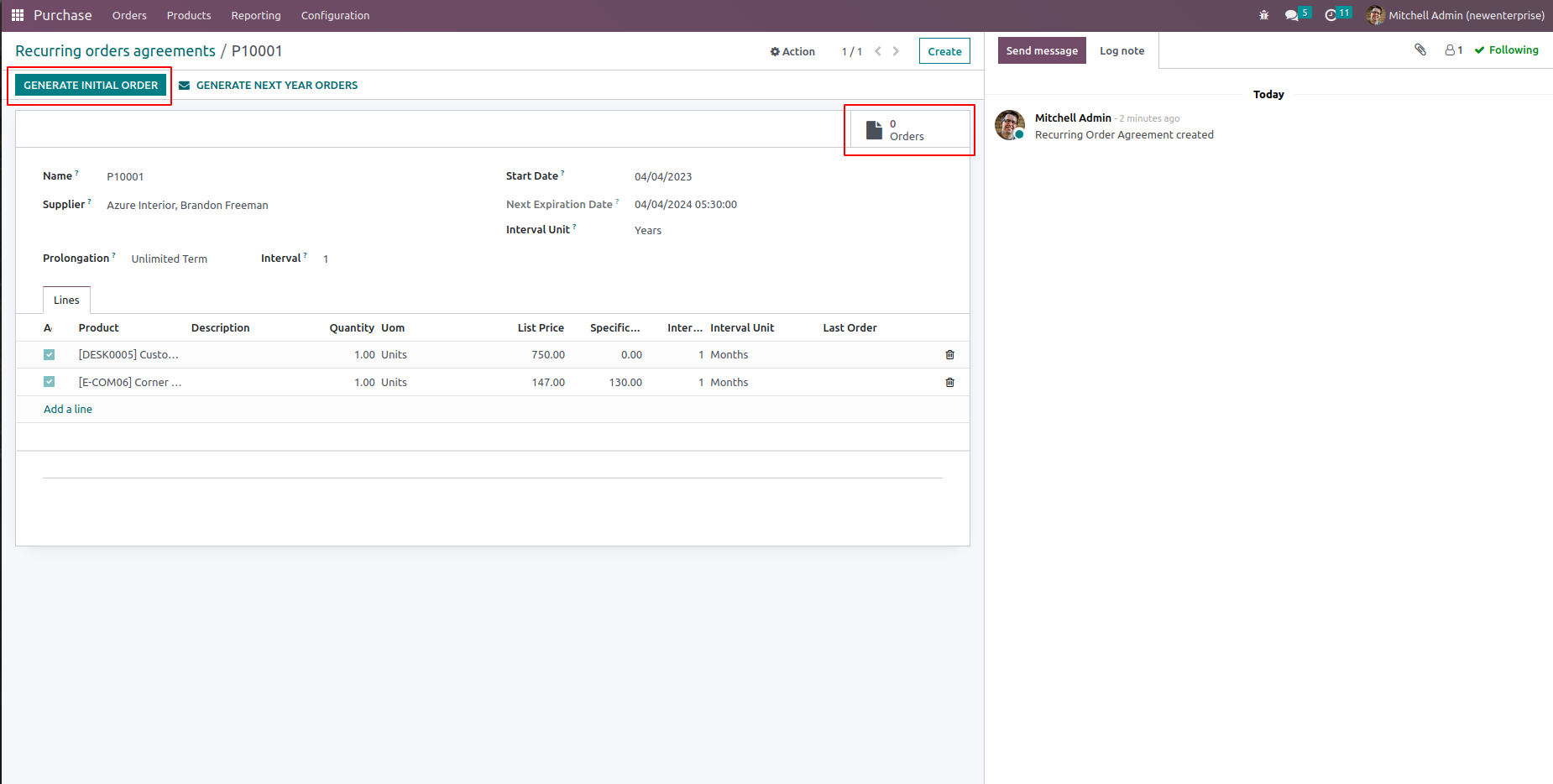 We can see all orders created from the recurring purchase agreement from the smart button which shows the number of orders.