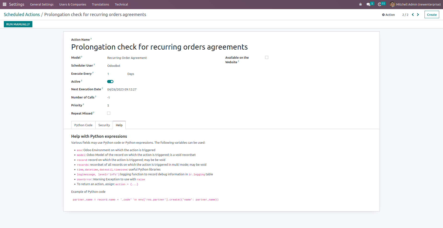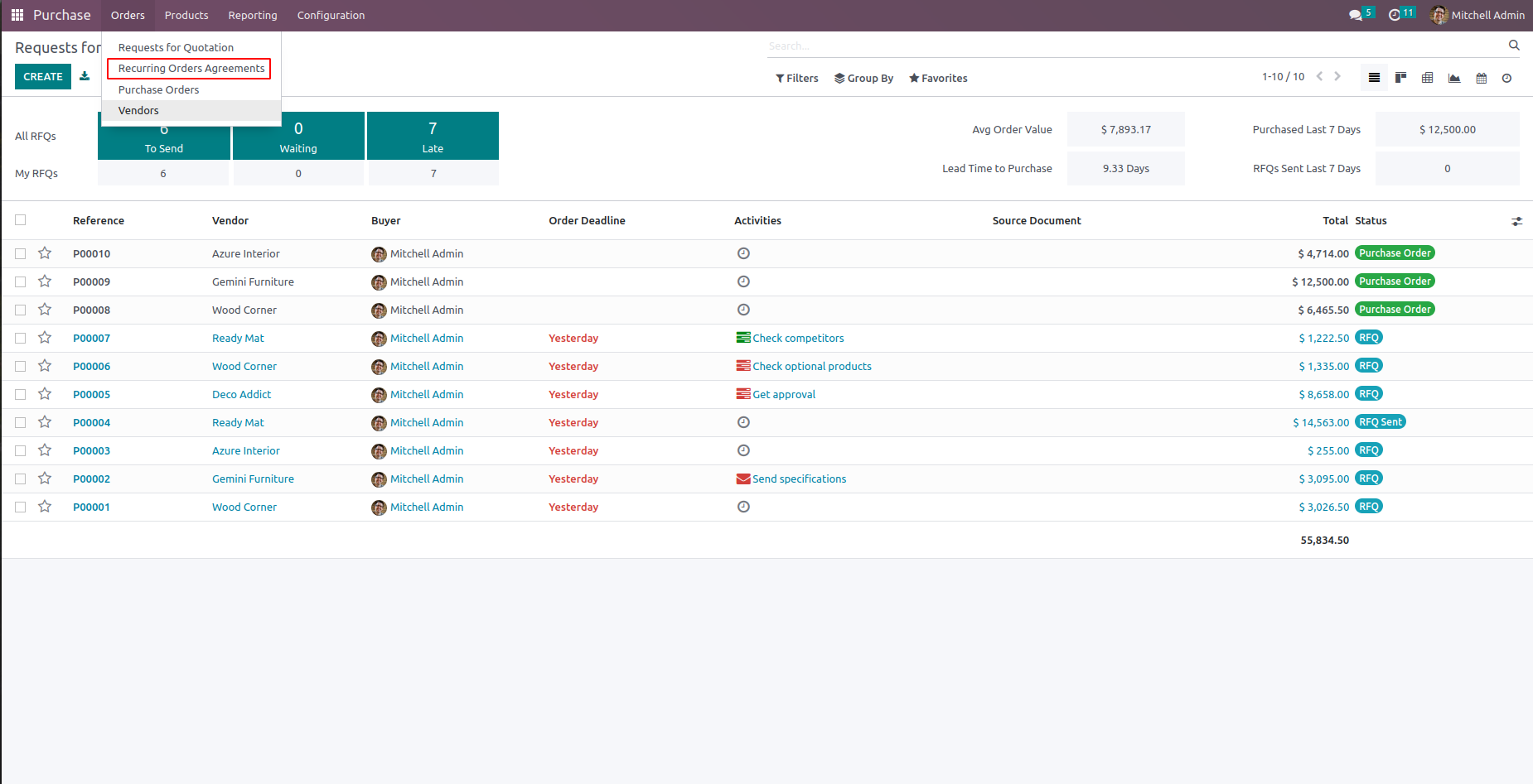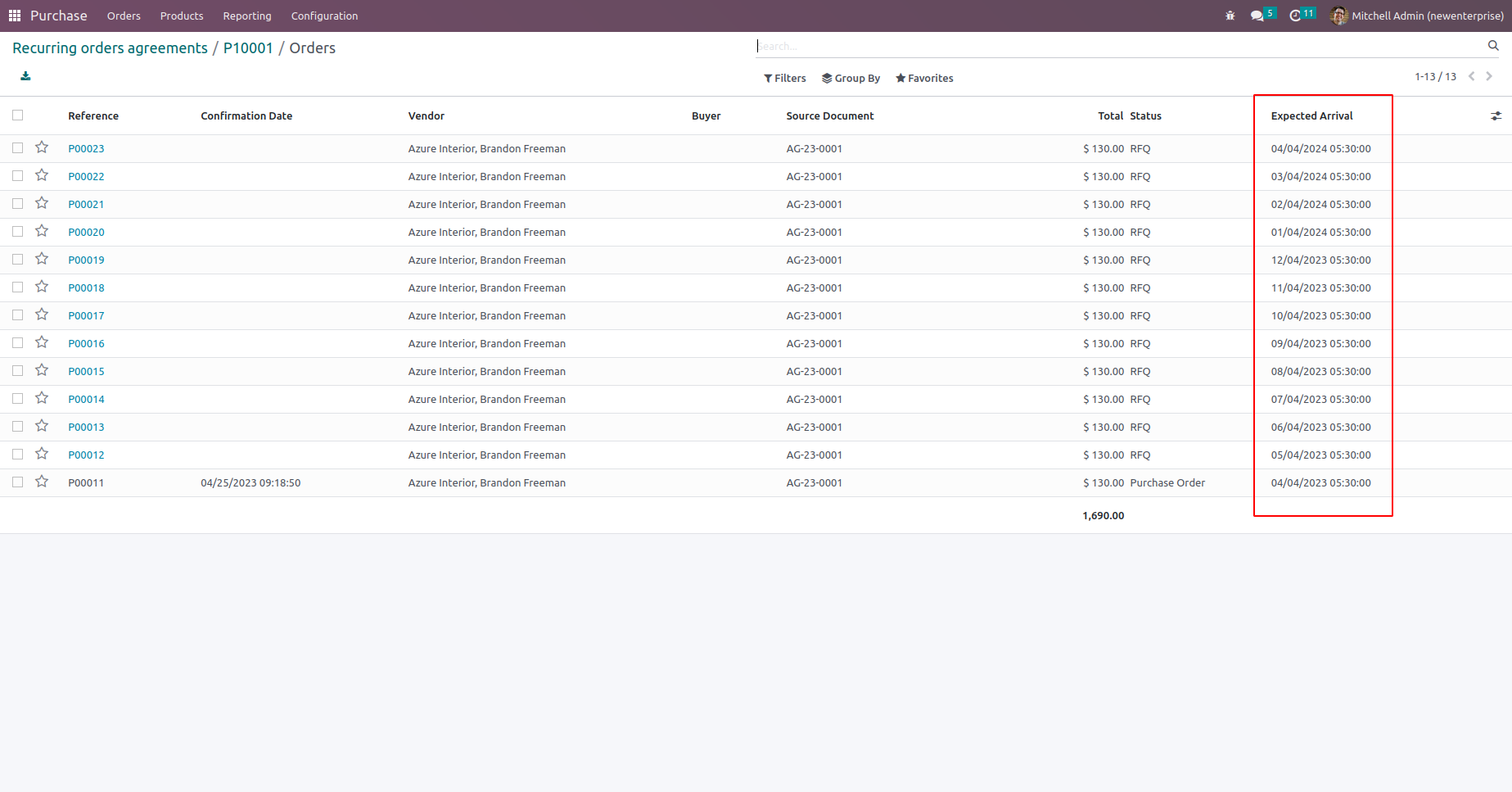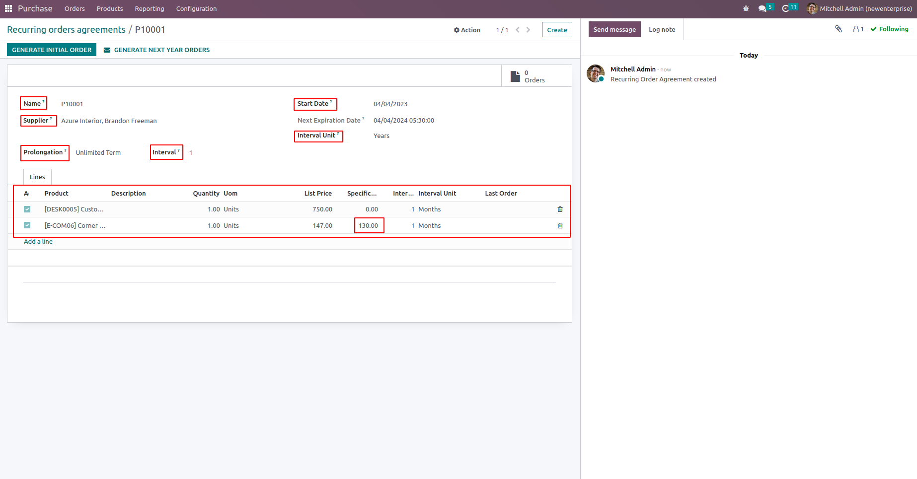 We can see all orders created from the recurring purchase agreement from the smart button which shows the number of orders.