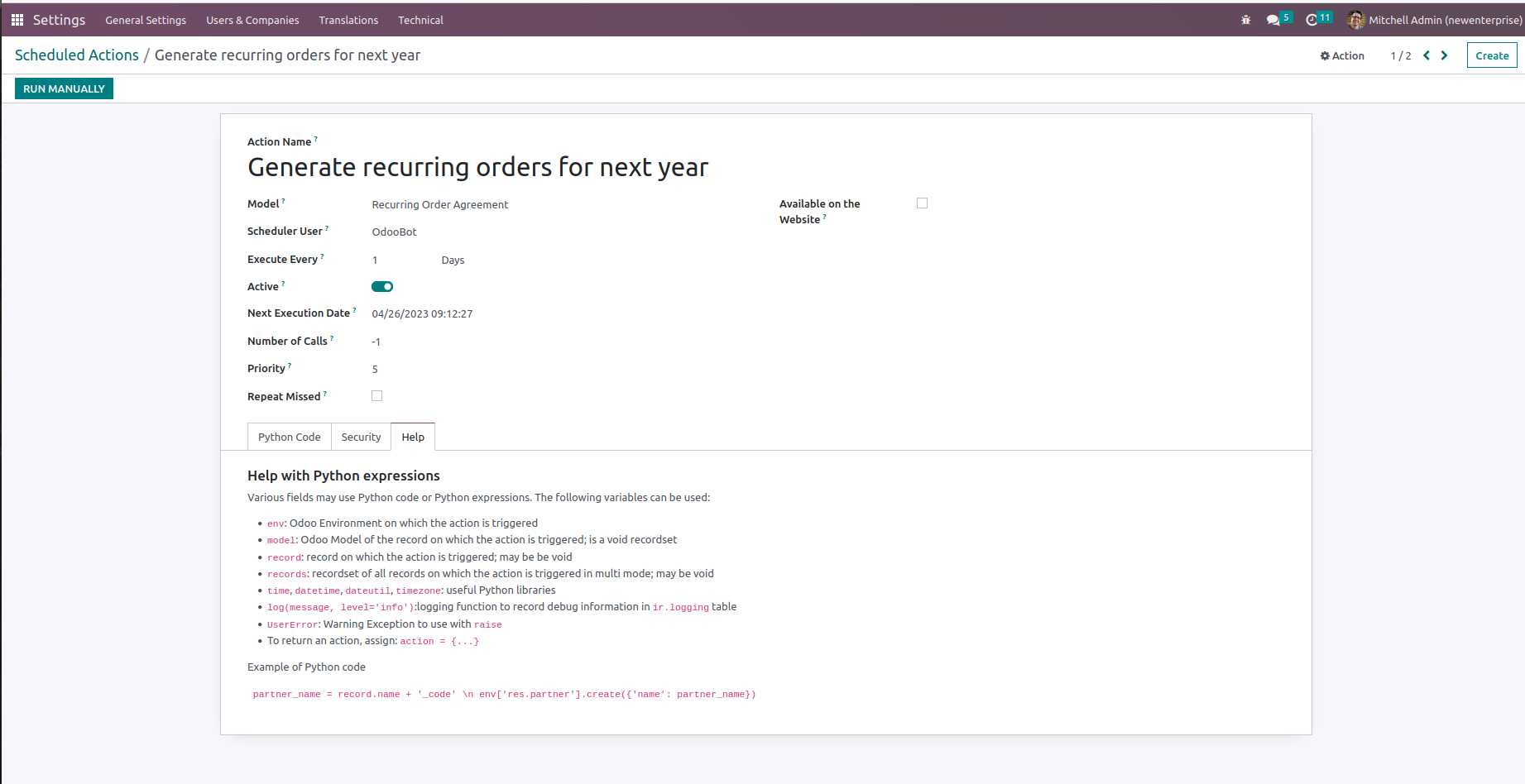 Scheduled action for creating recurring orders