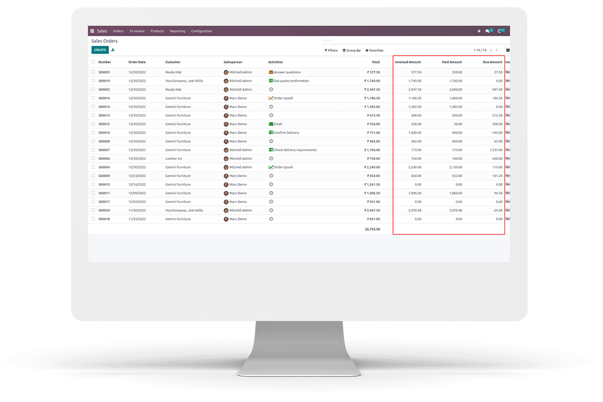 You can view the Invoiced amount, Paid amount and Due amount on sale orders list view.
