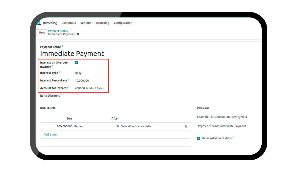 The module automatically calculates interest on overdue invoices during invoice creation, helping businesses manage late payments and improve cash flow.