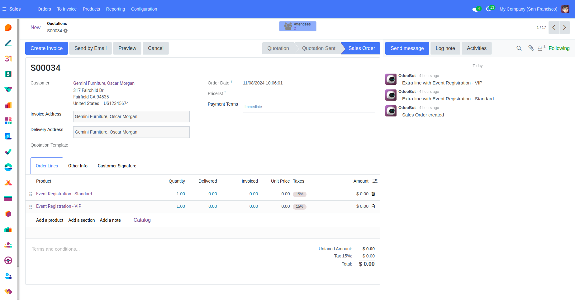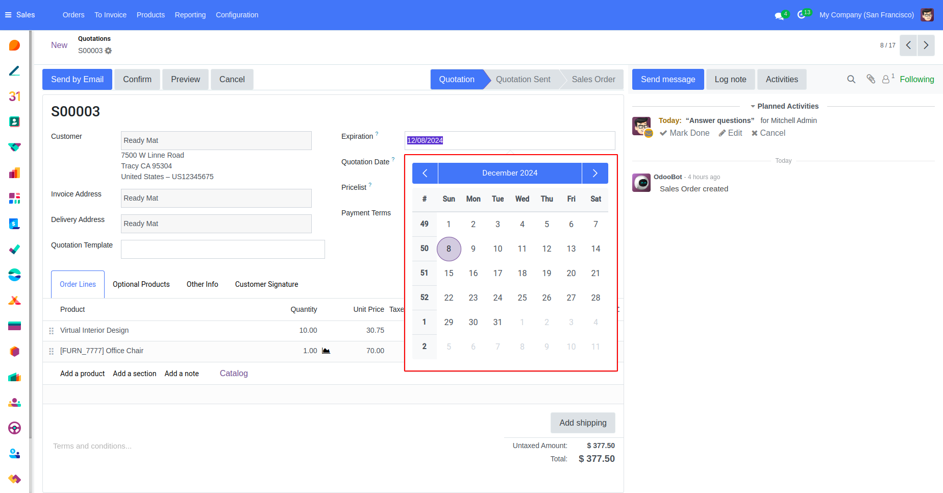 The Form View in the "Dodger Blue" theme for Odoo 18 offers a streamlined, user-friendly design with a blue and white color scheme that improves readability. Key details are organized intuitively, with clearly labeled fields and sections, making data entry and editing straightforward. This responsive layout provides a clean, modern look that enhances the user experience while allowing efficient management of detailed records.