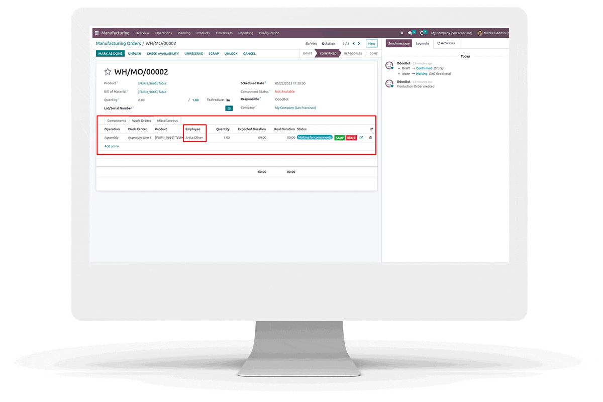 If enabled, the Work order tab will be added. And there will be an option to choose the employee for the corresponding work order.