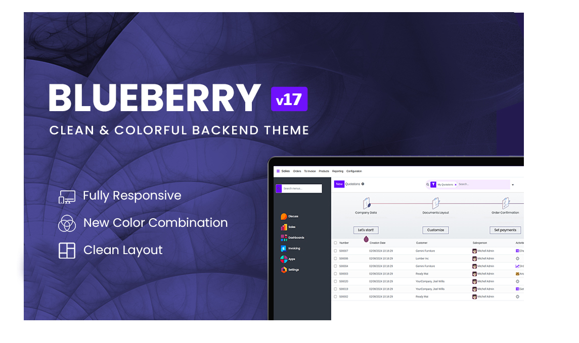 The Blueberry Backend Theme V17 Gives You a user-friendly backend theme for Odoo 17.0 community edition.It will Give You a Clean Layout with a New Color Combination and a Modified Font. It has a Sidebar with New App Icons and Company Logo. This Will Change Your Old Kanban, List, and Form Views to A Fully Modified View.