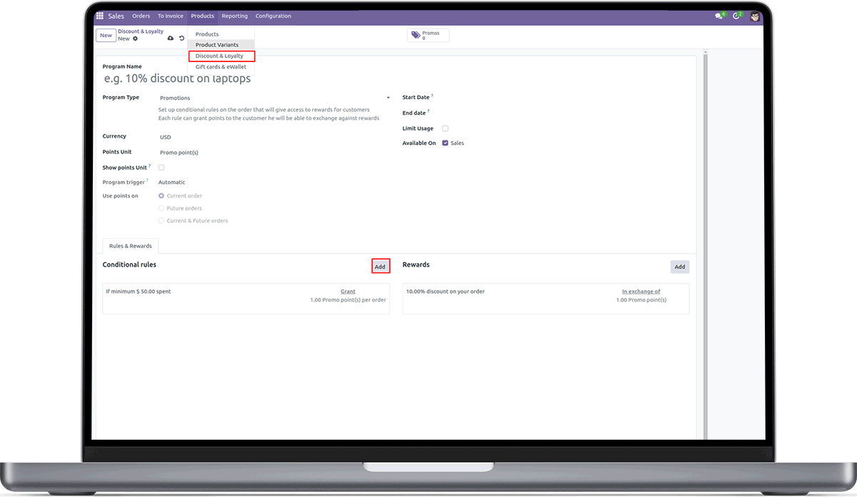 Firstly you should ensure that the debug mode is on. Go to Sale -> Products -> Discount & Loyalty ->Create a new program. After creating the program we can see that a 'Add' button in Rules & Reward section.