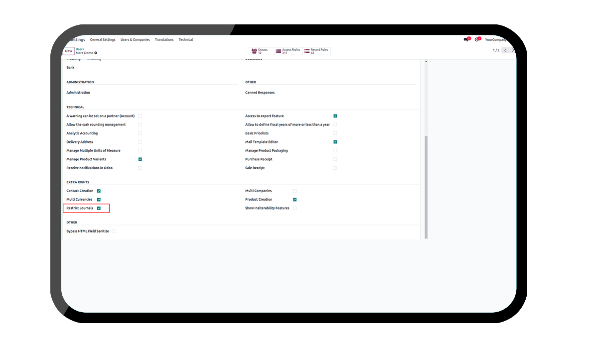 Go to Settings -> Users -> Restrict Journals You can see a checkbox to enable Restrict Journals, after enabling this a page will be visible.