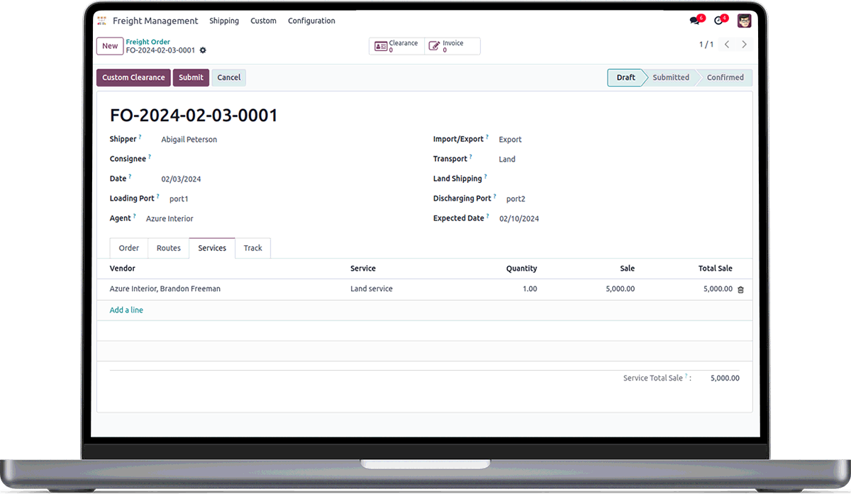 By clicking the Custom Clearance button we can create the Custom clearance for the Freight Order. We can view the Custom Clearance in Custom Clearance menu under the Custom. After Conforming the Custom Clearance, we can confirm our Fright Order.