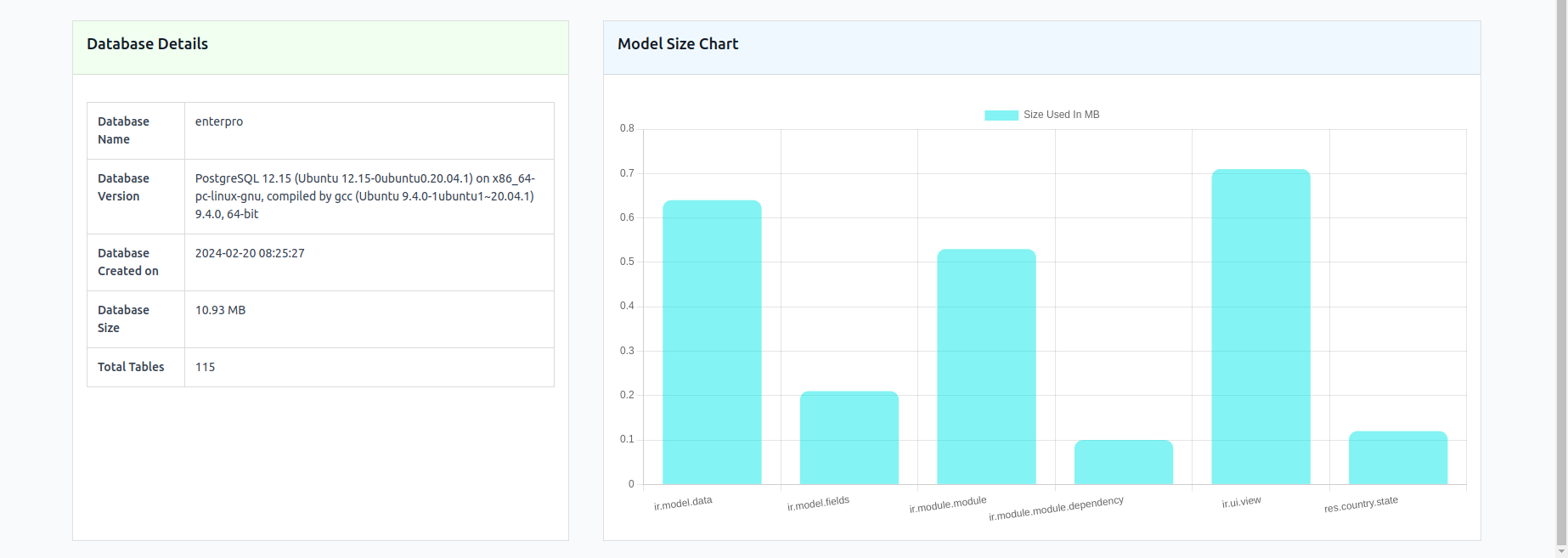 Details about the System Monitor, Database, and a chart showing how much storage is used by various models are all shown on the dashboard.