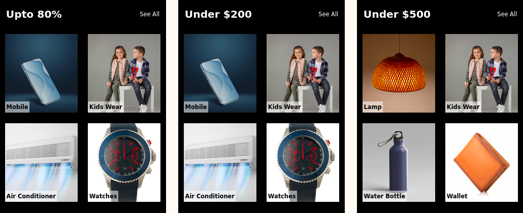 Provides Structural snippets like Collections, Subscribe, Choose , Cards, Banner and Dynamic content snippets like Asked Questions, Best Seller Products, Most Rated Products, New Arrivals