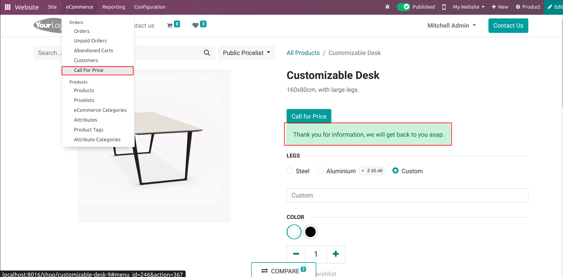 In certain situations, it becomes necessary to conceal the price of a product or one of its variants. These instances may arise due to various reasons such as customization, availability issues, or when the product is offered for free. This module facilitates the hiding of prices and the addition of a "Add to Cart" button for designated products. The "Call for Price" option enables customers to send a price inquiry to the merchant.