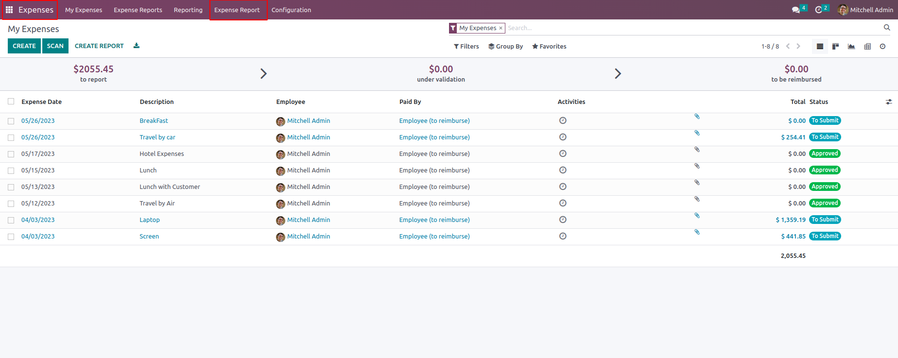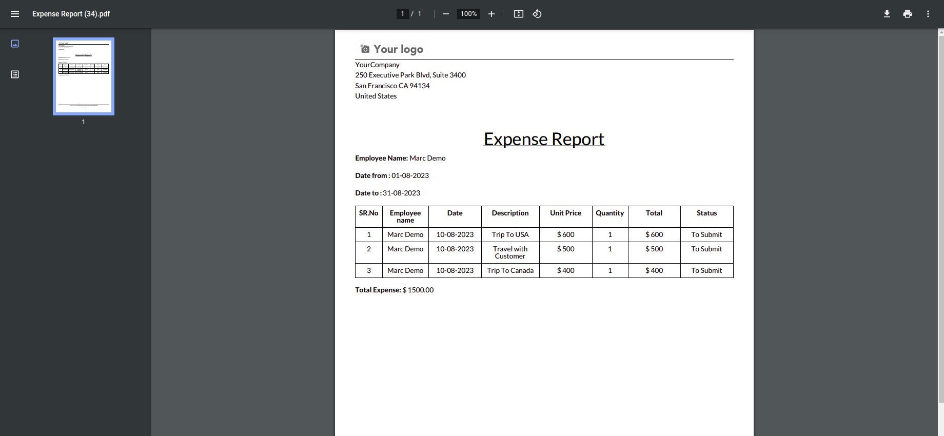 Employees can print the report by status like to submit, submitted, approved, paid, refused, all, etc.
